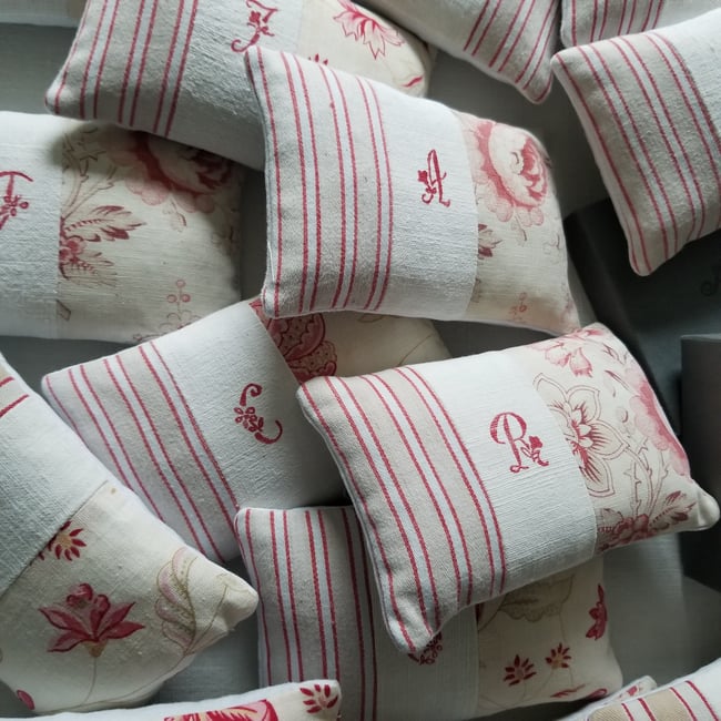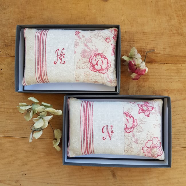 Antique French floral and ticking patchwork lavender bag with our unique printed monogram, filled with Lavender. This product comes in its own box, making it an ideal gift. There will be slight variations in the florals and tickings used, but all of them are very similar to the ones pictured. The sampler shows the alphabet we have created and the letters that will be used on your lavender bag.